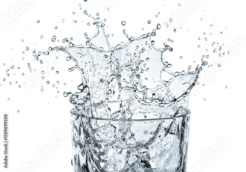 Multitude of crystal-clear transparent water droplets and dynamic splashes, perfectly frozen mid-air with ethereal shapes and sparkle, against a pristine transparent isolated studio background,
