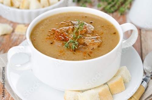 mushroom soup with thyme and croutons horizontal close-up