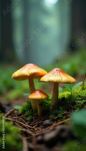 Mushrooms growing among pine needles in a misty forest, greenery, trees, wildlife