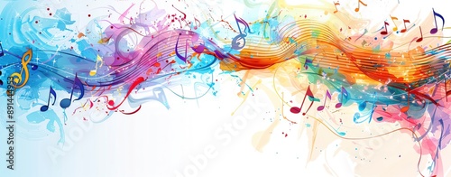 Music Theme Background with elements like musical notes, instruments, or soundwaves in vibrant colors. Ensure there is ample space for text.