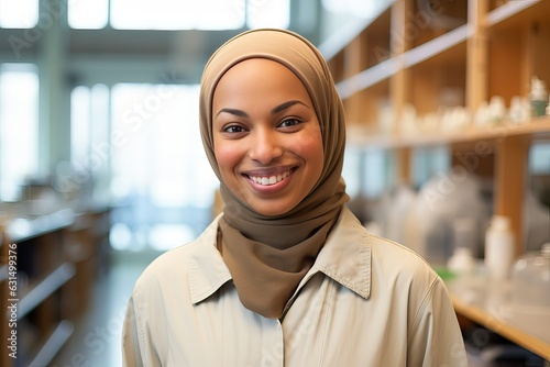Muslim Hijabi Chemist smiling at the camera, Scientist Women in STEM feminism