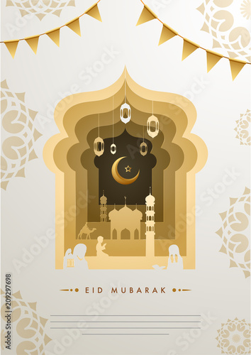 Muslim people praying in front of mosque in paper cut style greeting card design for Eid Mubarak celebration.
