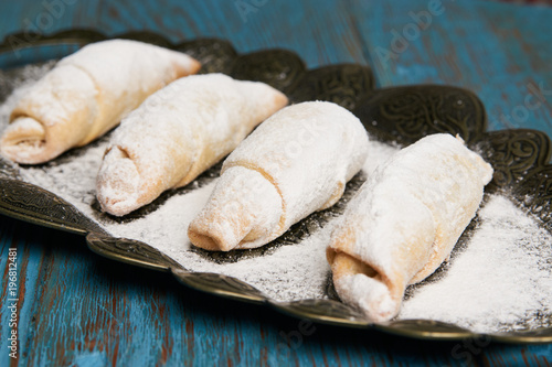 Mutaki cookies rolled with powdered sugar on copper tray on rustic wooden table, turkish food
