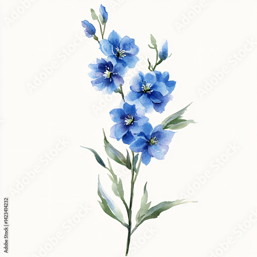 My A Watercolor hand-painted, hand-drawn Delphinium branch on a white background, flat watercolor painting, simple design, AI painting design, AI