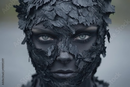 Mysterious face covered in black feathers