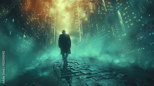 Mysterious Figure in a Foggy Urban Landscape