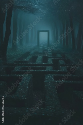 Mysterious night scene a dark forest path leads to a luminous gateway. A maze-like pattern adds intrigue. Perfect for fantasy, mystery, or adventure themes.