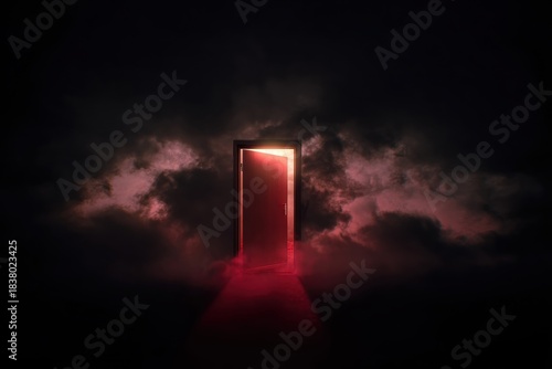 Mysterious red door opening in dark cloudy atmosphere with light beam