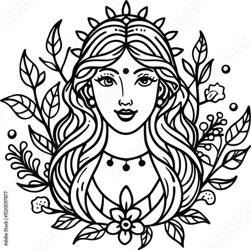 Mystical Feminine Illustration: An enchanting black and white line art illustration, portraying a beautiful woman encircled by floral elements, embodying grace and spiritual essence.