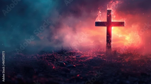 Mystical Glowing Cross in Fiery and Misty Landscape at Dusk Spiritual and Surreal Scene