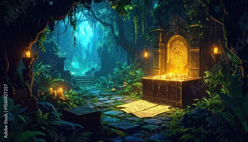 Mystical Jungle Ruins with Bioluminescent Glow and Hidden Treasure