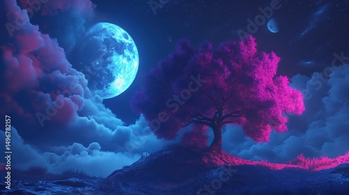 Mystical luminous moonscape featuring a solitary tree and celestial clouds