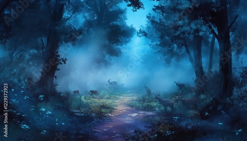 Mystical path through an enchanted forest with glowing flora and roaming wildlife