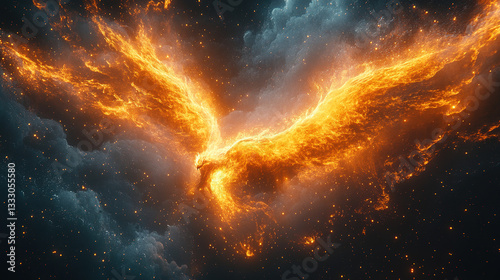 Mythical phoenix rising from ashes ethereal sky digital artwork fantasy realm dramatic perspective fire element