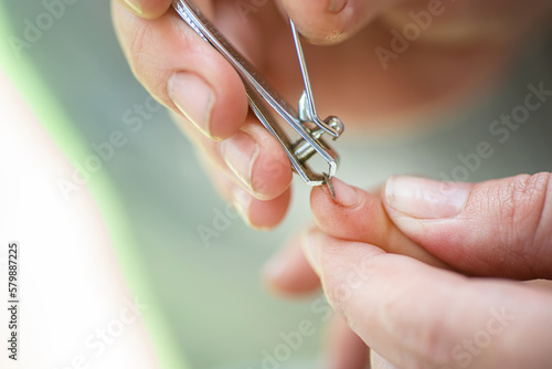 Nail care. Hygiene and manicure for children. A single mother cuts off her daughter's Ugly dirty nails.