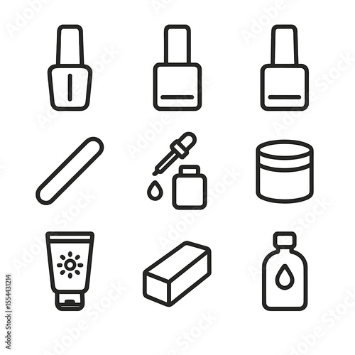 Nail Care Icons. Outline icon set of Nail Care Product Section: nail polish bottle, base coat, top coat, nail file, cuticle oil