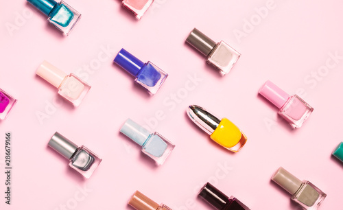 Nail polish bottles pattern background. Close up.