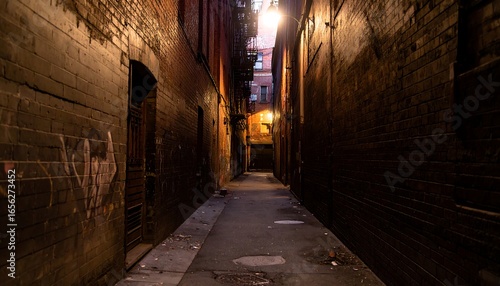 Narrow alleyway lined with brick walls at dusk.
