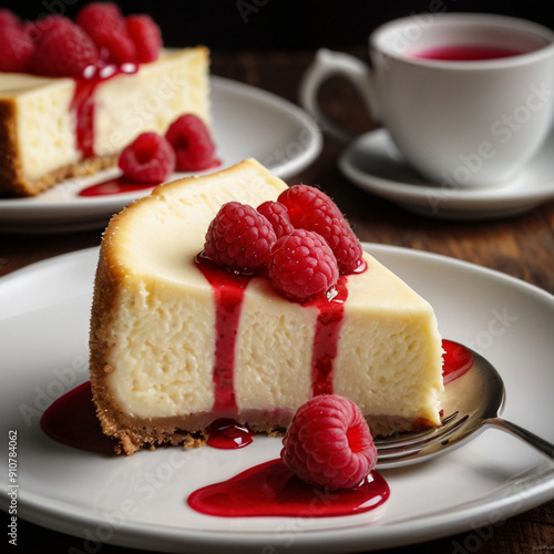 National Raspberries n’ Cream Day. Plate with delicious raspberry cheesecake. On a wooden background