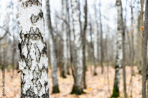 natural background - birch tree trunk close up and bare trees in grove on blurred background in city park on overcast autumn day (focus on left birch tree trunk on foreground)