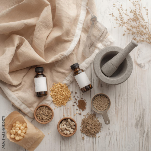 Natural ingredients and essential oils arranged on rustic wooden table evoke sense of calm and wellness