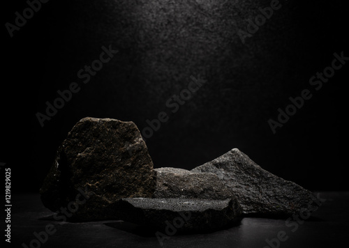 natural stones with texture for cosmetic podium background.black granite stones with green moss in composition on dark background for presentation of cosmetics medicine jewelry products