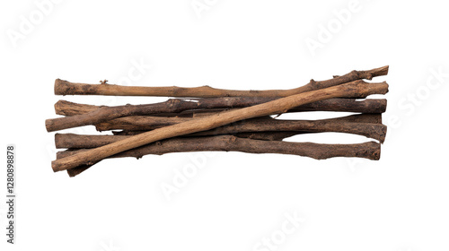 Natural wood sticks, assorted slender branches in earthy tones, perfect for crafting or decor, ample space for text. Isolated on white background or PNG