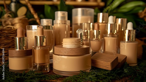 Natural-themed cosmetic containers with wood-inspired caps and greenery in background