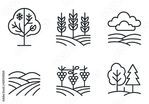 Nature and agriculture linear icon set. featuring tree, wheat, cloud, landscape, vineyard, and forest symbols.