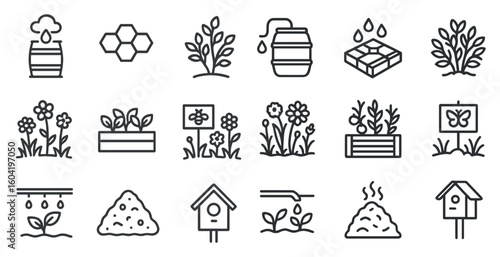 Nature and gardening line icons set – outline, linear, eco and landscape symbols