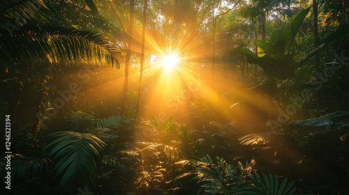 Nature backgrounds with golden sunlight streaming through a dense forest canopy