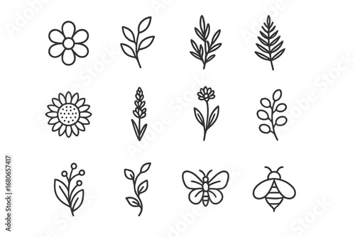 Nature Icon Grid. Outline icon set of nature vibe packaging: flower blossom, leaf branch, herbal sprig, fern