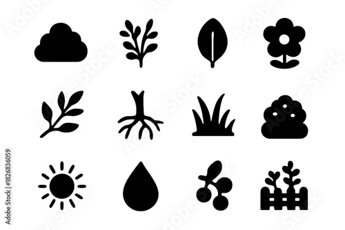 Nature Icons Collection. Greenery. Solid icon set of bush, shrub, leaf, flower, branch, roots, grass, soil, sun, water droplet, berries, garden. Filled icons