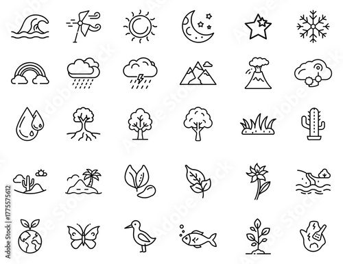 Nature Icons Set – 30 Minimal Line Art Vector Illustrations of Weather, Plants, and Environment