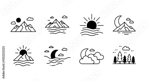 Nature Icons Set: A clean and minimalist collection of nature icons depicting various landscapes, including mountains, sun, moon, clouds, trees and water, perfect for design elements.