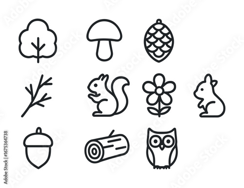 Nature icons set: tree, mushroom, pinecone, squirrel, branch, flower, acorn, log, owl