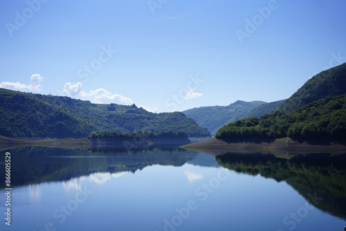 Nature reserve park Uvac river with beautiful mountains, green lush forest, clear sky with no clouds and blue water and bald eagles in south Serbia in the Balkans in Europe