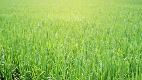 Nature view green rice field with sun light as background or wallpaper