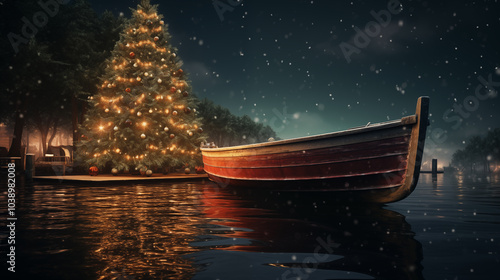 Nautical Christmas Tree Scene on a starry night by the water ~ Created using Generative AI