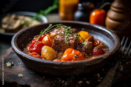 Navarin d'Agneau in a rustic setting, showcasing plated dish with contrasting textures