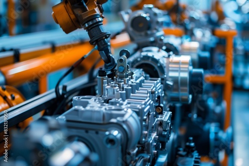 ndustrial component on an assembly line, precise machinery, vibrant lighting, manufacturing setting