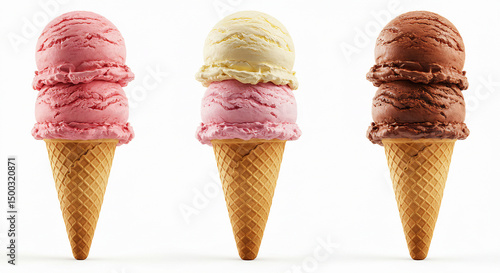 Neapolitan ice cream cone with strawberry, vanilla, and chocolate on a white background.