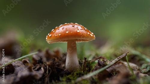 Nearby, in the forest, a small, bright, beautiful mushroom grew, grass, moss, fly agaric, wildlife