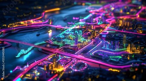 Neon Cityscape at Night Pixelated Urban Landscape with Glowing Lines and Bright Lights