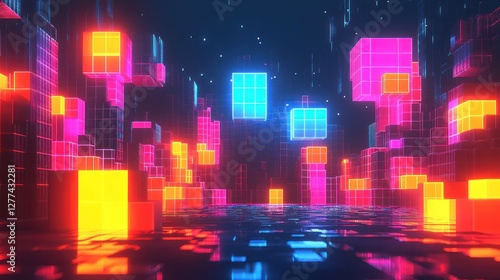 Neon cityscape with vibrant glowing cubes and digital reflections.