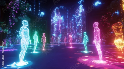 Neon Dreamscape: Luminescent Humanoids in a Mystical Digital Garden