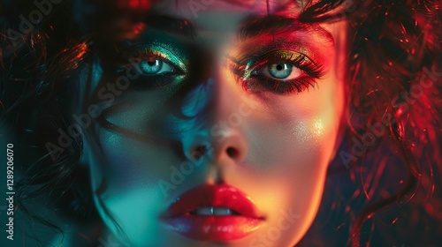 Neon glamour with bold makeup portrait image. Beauty woman with dramatic lighting, metallic eyeshadow, red lips picture photorealistic photography. Fashion model concept photo realistic