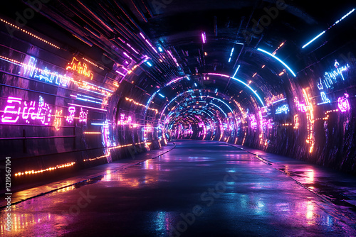 Neon Laser Beams Cutting Through a Dark Tunnel, Creating a Stark Contrast of Shadows and Vibrant Light, Adding Depth, Mystery, and Futuristic Vibes to the Scene