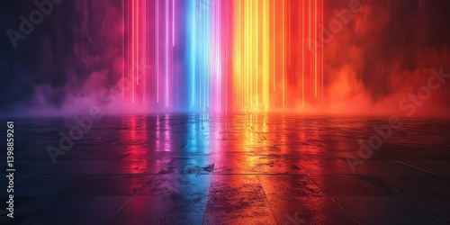 Neon light beams on reflective wet floor futuristic abstract landscape