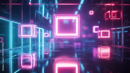 Neon lights and glowing cubes create a futuristic abstract background